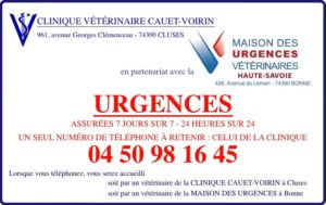 URGENCES En dehors des heures d’ouverture, nos urgences sont assurées en partenariat avec la Maison des Urgences Vétérinaires à Bonne pour une prise en charge 7 jours sur 7, 24 heures sur 24.